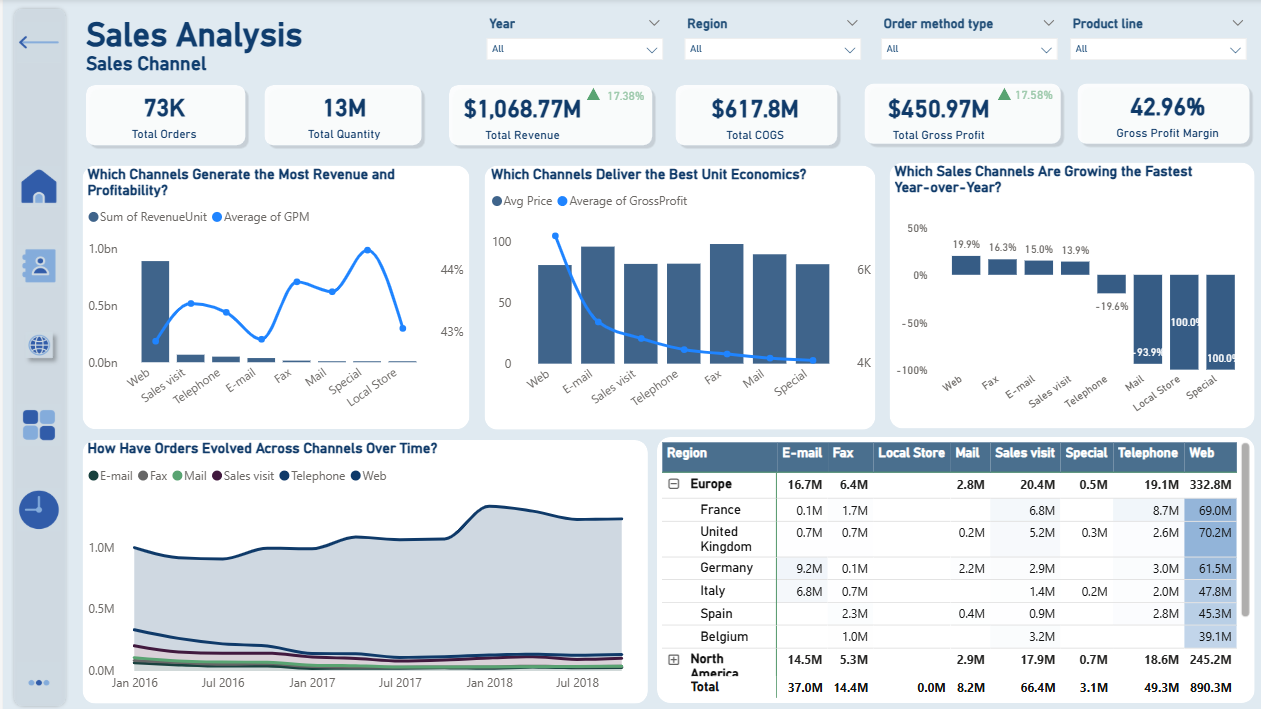 Kênh Web là kênh phân phối chủ đạo và vượt trội về mọi mặt, chiếm hơn 80% tổng doanh thu và là kênh tăng trưởng mạnh nhất. Kênh này cũng mang lại AOV (Average Order Value) và lợi nhuận gộp cao nhất (GPM khoảng 43–44%), khẳng định tính hiệu quả kinh tế tuyệt đối. Các kênh truyền thống như Sales Visit và Telephone có xu hướng giảm dần, kém hiệu quả kinh tế và cần được cải thiện hiệu suất hoặc chuyển đổi thành các dịch vụ hỗ trợ. Các kênh phụ khác (Mail, Fax, Local Store) đóng góp doanh thu thấp nhưng cần được đánh giá lại: giữ lại những kênh còn sinh lợi (Mail/Fax) và cải thiện hoặc chuyển đổi các kênh kém hiệu quả (Sales Visit/Telephone) thành các kênh chăm sóc/hỗ trợ khách hàng. Chiến lược cần ưu tiên tập trung vào kênh Web để tối đa hóa lợi nhuận.