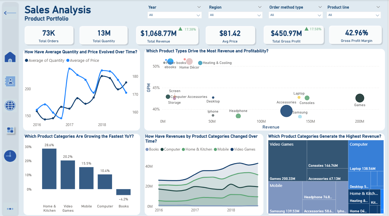 Chiến lược sản phẩm phải ưu tiên tăng trưởng các danh mục lợi nhuận cao như Video Games, Mobile và Computer. Đặc biệt, cần kiểm soát chi phí đơn vị (COGS) đối với sản phẩm Mobile để cải thiện biên lợi nhuận. Do tiềm năng tăng trưởng nhanh và biên lợi nhuận cao, cần khuyến khích mở rộng danh mục Home & Kitchen. Đối với danh mục Books, cần tái cấu trúc và áp dụng chiến lược giảm tồn kho. Để tăng giá trị trung bình đơn hàng (AOV) và biên lợi nhuận, doanh nghiệp nên đầu tư vào phát triển các sản phẩm cao cấp.